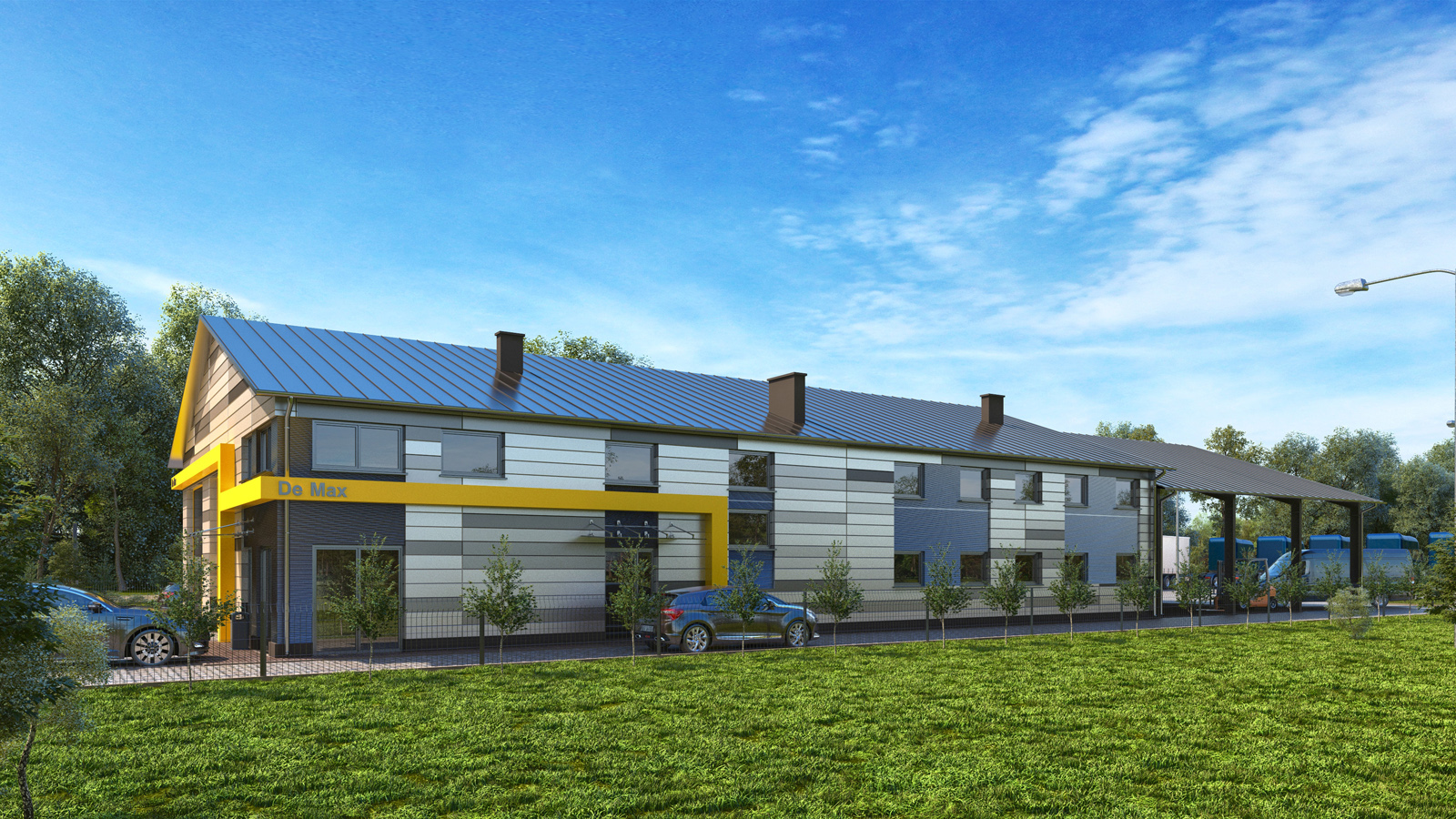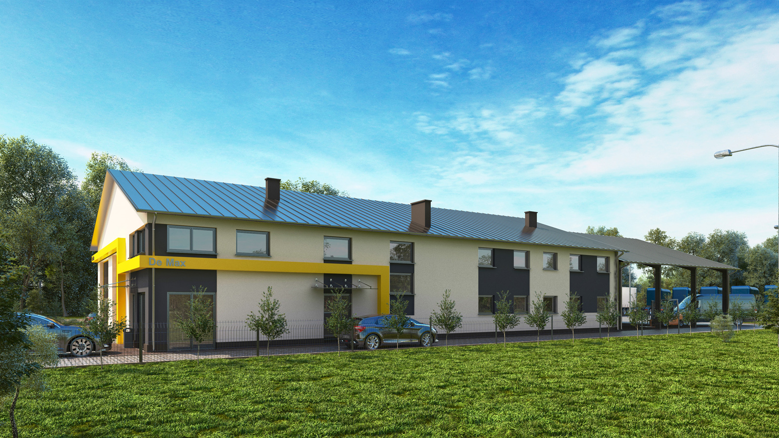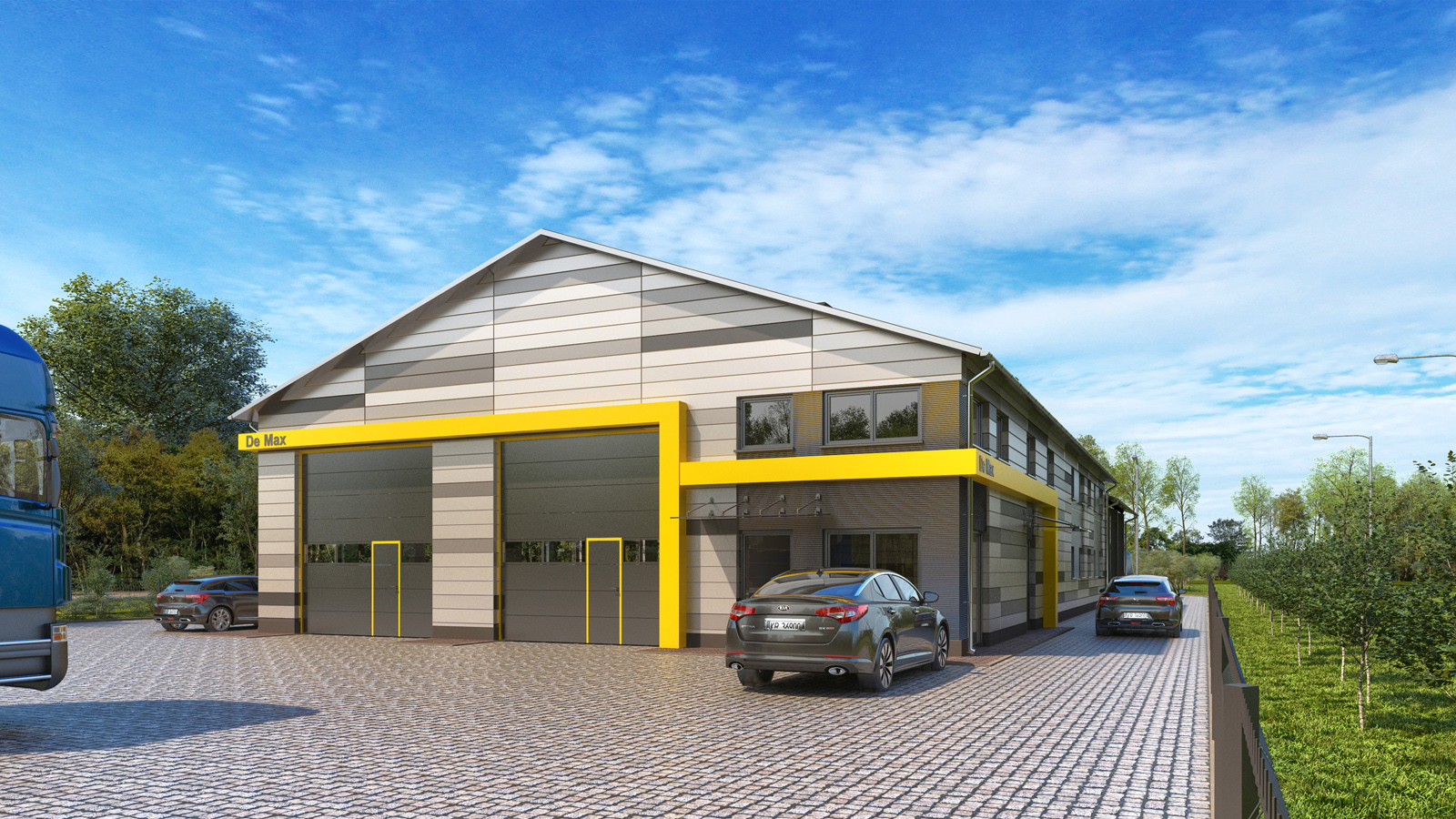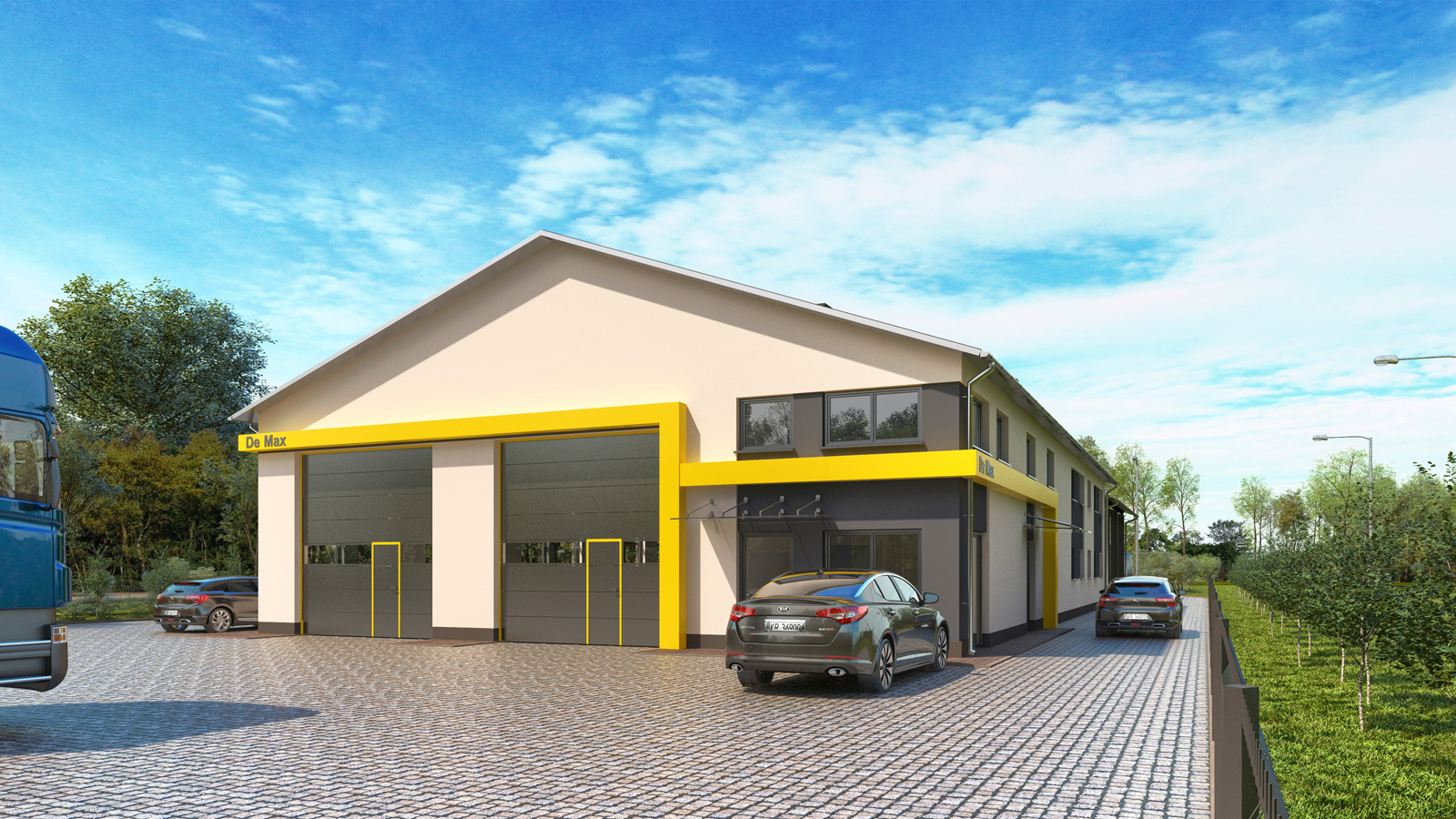 Wizualizacja architektoniczna – Hangar z biurami firmy motoryzacyjnej – Czerwiec