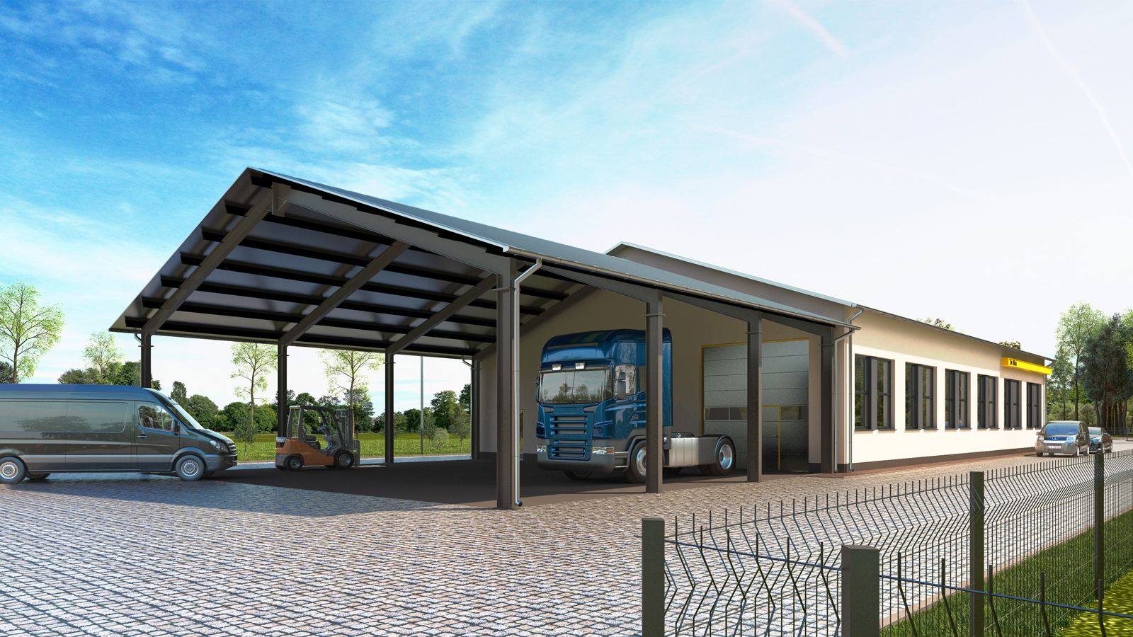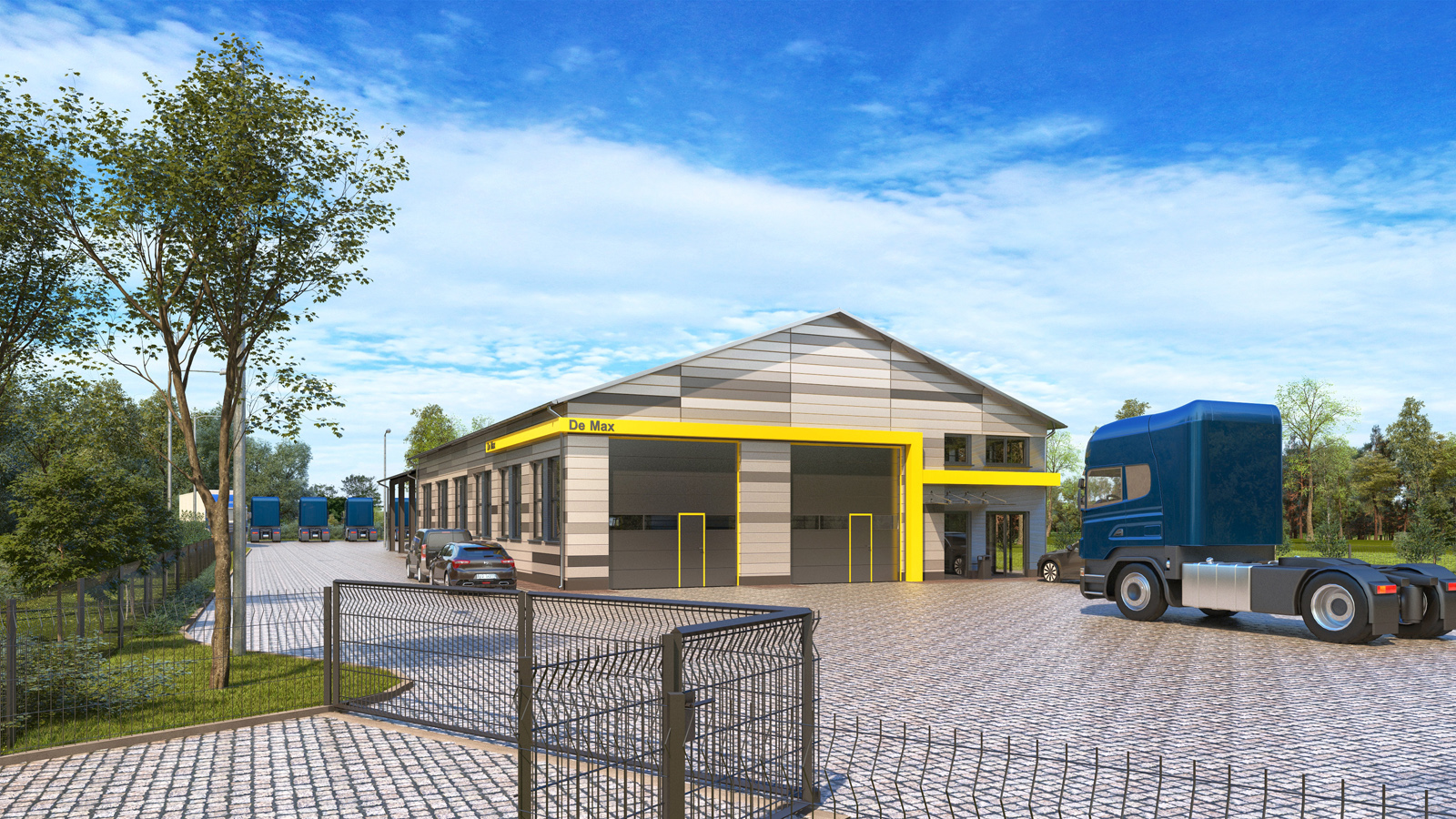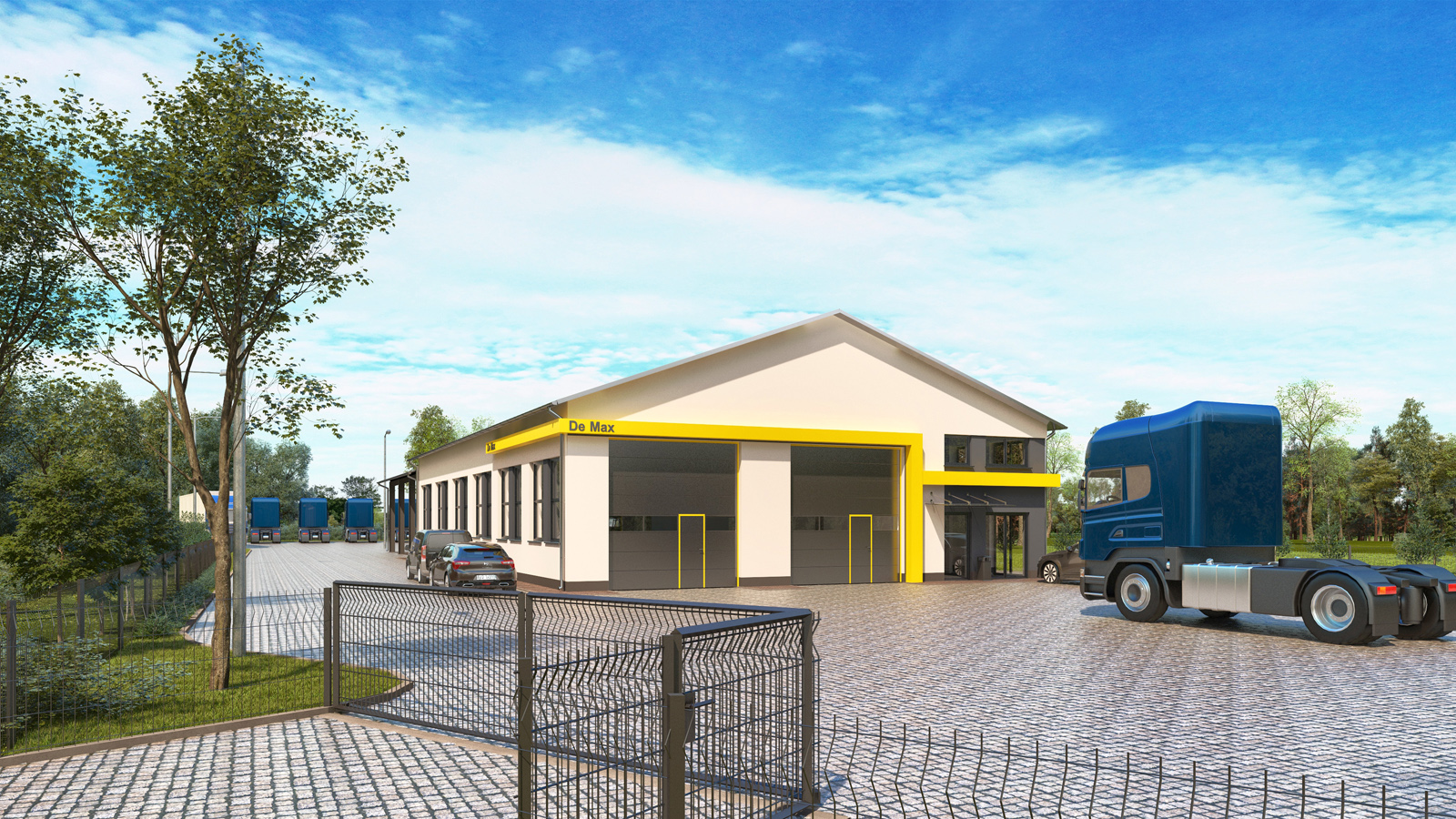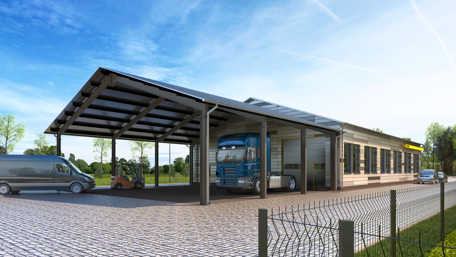 Wizualizacja architektoniczna – Hangar z biurami firmy motoryzacyjnej – Czerwiec
